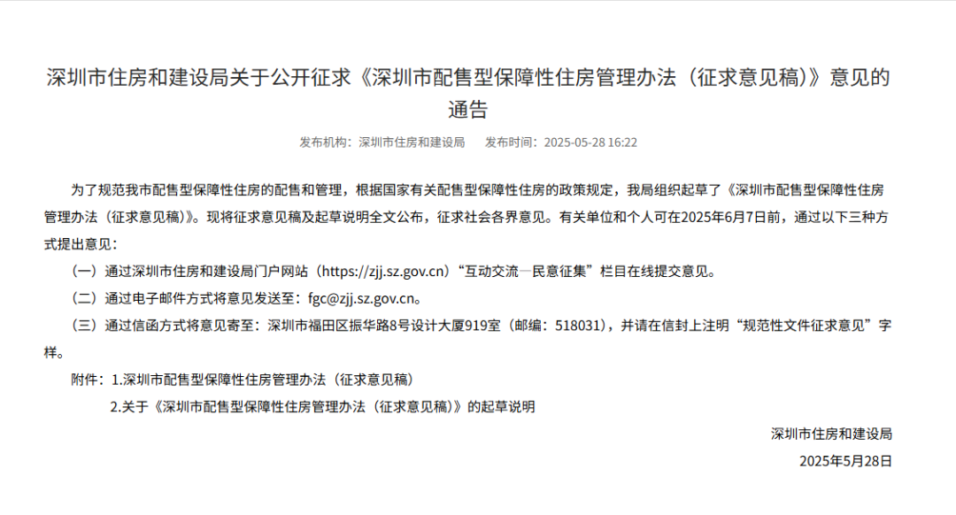 5月28日,深圳市住房和建设局网站发布了《深圳市配售型保障性住房管理办法(征求意见稿)》《深圳市保障性住房规划建设管理办法(修订征求意见稿)》。