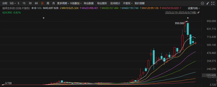 当地时间6月5日,脑再生科技收跌0.82%,报624.95美元/股。至此,公司总市值已高达81.32亿美元(折合584亿元人民币),公司股价年内上涨超125倍。
