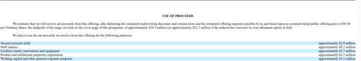 当地时间2021年7月16日,脑再生科技在纳斯达克上市。公司IPO定价为9.5美元/股,发行230万股,募资2185万美元。公司拟将本次IPO募集资金中的1930万美元用于第二阶段的研究。