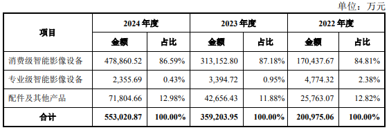 公司消费级智能影像设备包括全景相机、运动相机、手持摄影设备及网络摄像头等。全景相机是能通过鱼眼等广角镜头实现360°全景拍摄的相机;运动 相机是外形小巧、具有较强防抖功能、能适用于高强度运动状态下拍摄的相机。公司消费级智能影像设备产品主要包括ONE X系列、Ace系列、GO系列、ONE R 系列、瞳 Sphere、Link 系列、Flow 系列、Nano 系列等。在全景相机领域,公司凭借先进的研发技术及产品优势,已成长为全球全 景相机行业领先企业。根据 Frost & Sullivan 的数据,2023 年公司品牌“Insta360 影石”全景相机全球市场占有率 67.2%,排名第一。在运动相机领域,公司通过全景技术、模块化技术、高性能防抖等技术持 续推出创新性产品,加速占领国内外市场。公司“Insta360 影石”品牌在 Frost & Sullivan 的 2023 年全球运动相机排名中位列第二。
